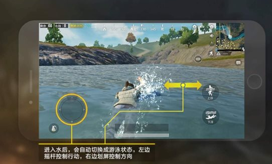 1.进入水后,会自动切换成游泳状态,左边摇杆控制行动,右边划屏控制方向。