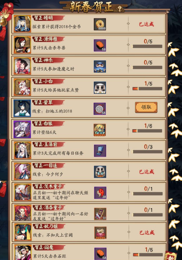 阴阳师新春贺正完成12个任务即可解锁奖励,包括了2018年限定头像框「戊戌新年」和神秘的符咒*3.