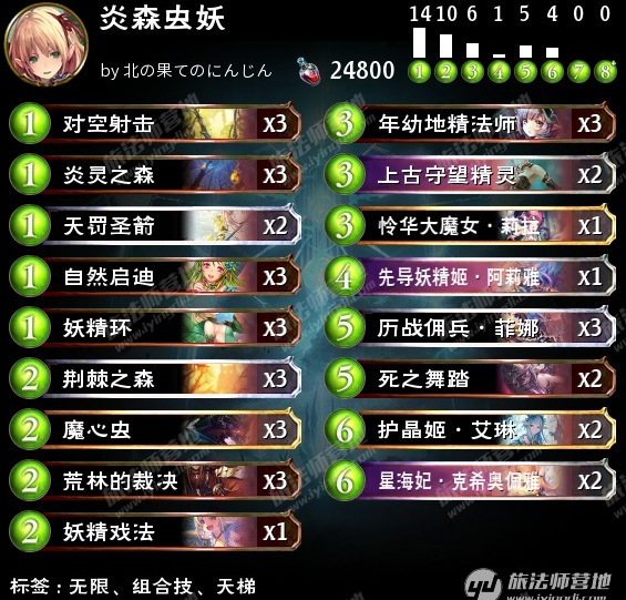 除了炎森,这套牌的另一个特点是没有使用神树的姬巫女。阿莉雅被限后,很多玩家重新起用姬巫女,以维持6张0费牌源的配置。然而,这实际上还是被过去的思路限制了。姬巫女是标准的纯组合技组件,对站场帮助很小,一旦没有进化点可吃就非常愚蠢。但她对组合技的帮助又没有阿莉雅那么强,即便使用她也无法让虫妖稳定在7费斩杀。与其做半吊子的“组合技偏向型”,还不如踏实一点,选择“控场偏向型”。