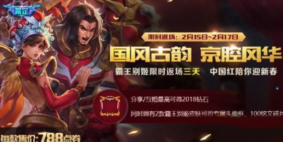 王者荣耀霸王别姬返场几天?王者荣耀2018春节限定返场活动开放,2月15日-17日限时三天,可获得霸王别姬。接下来就跟西西一起看看2018春节限定返场霸王别姬活动详解吧!
