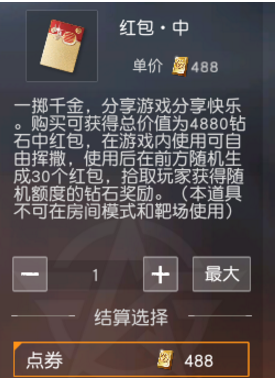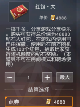 红包的种类分为三种,分别是红包大,红包中,红包小。售价自然也不同,大红包4888点券,中红包488点券,小红包48点券。