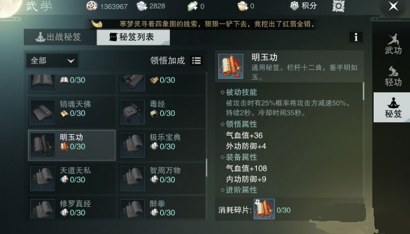 在不追求金色和紫色秘籍的情况下,可以选择五岳神定、明玉功、静心咒和神脉经的组合。静心咒会减少角色被强控的时间,神脉经会减少角色一定的内力消耗。这套组合还是在提高云梦的生存能力,在秘籍里加上神脉经,是为了避免战斗中云梦内力的不足。没有内力的云梦在战场上的作用会很低,同样,如果云梦的气力值不足,可以在秘籍中换上拈花指法来提高角色的气力值回复速度。气力值对于云梦的影响也很大。云梦对于秘籍的需求并没有太高,更应该注重根据自己的实际需要搭配秘籍,缺什么补什么。