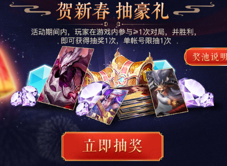 2、玩家游戏内参与一局或一局以上的对局并胜利,即可获得抽奖1次,单账号限抽1次!