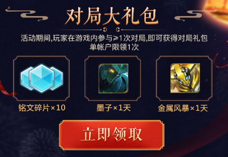 1、玩家游戏内参与一局或一局以上的对局,即可领取对局大礼包!