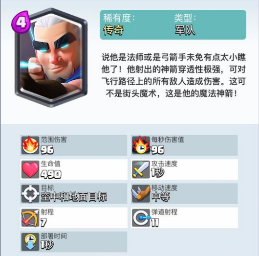 皇室战争神箭游侠可以说是十分的强势了,超远的射程,放在自闭卡组让对面痛苦。穿透性弓箭如果伤害高那也是让人绝望,下面是皇室战争神箭游侠的属性介绍,希望大家喜欢。