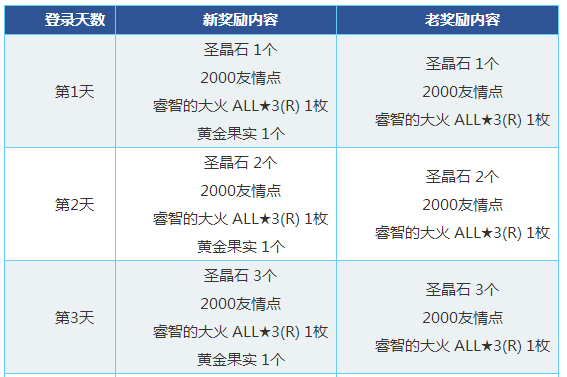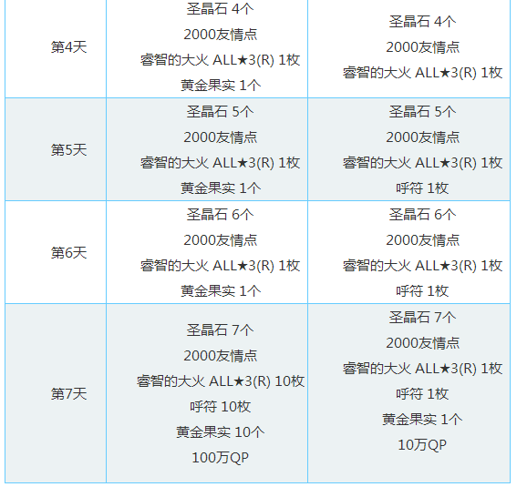 登录奖励共计可获得:圣晶石28个、呼符10枚、友情点14000点 、睿智的大火16枚、黄金果实16个、100万QP!