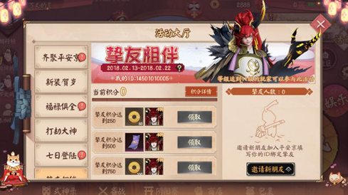 活动将从2月13日维护更新后正式开启,游戏等级11级及以上的阴阳师大人们可通过微信、微博、QQ、通讯录等方式将自己的ID分享出去,只要注册时间在2018年2月12日之后,且账号等级≤10级的新玩家输入了邀请人的ID,即视为邀请成功。每个阴阳师大大,可以邀请多位好友参与活动。