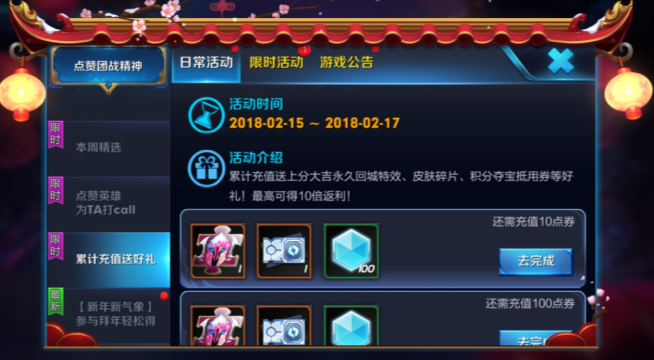 新春充值超级返利活动开启,最高可达10倍返利,累计充值1888点券还可获赠“上分大吉”回城特效(永久),祝您新的一年,福气旺旺,上分旺旺!~