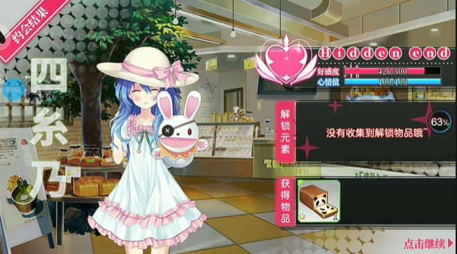 进入游戏面板后,当然首先要将看板娘设成四糸乃,否则,和自己老婆约错会了就尴尬了(这里不将详细介绍)点击进入约会模式,右下角约会,进入面包坊。进入后,会出现四糸乃面包坊的约会图面。左边为约会攻略进度,右边为每次约会以怎样方式结束。