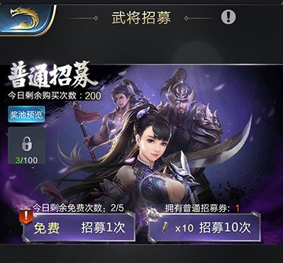 想要提升招募的几率推荐就是可以多个数量招募一次,尤其是高级招募,我们的橙色武将是最难出的,只有运气好才能招募到,所以我们招募的时候数量多,速度也不能太快,只能慢慢的招募。