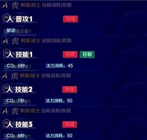 1技能,人,CD 6s,法力消耗45,是物理控制技能