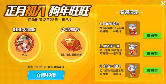 在2月23日(初八)当天,集齐三种汪汪不仅能100%免费兑换新年专属永久头像框,还有大吉福卡等你来拆,开启必得点劵奖励,最高可达888点券,快来试试新年吉运吧~