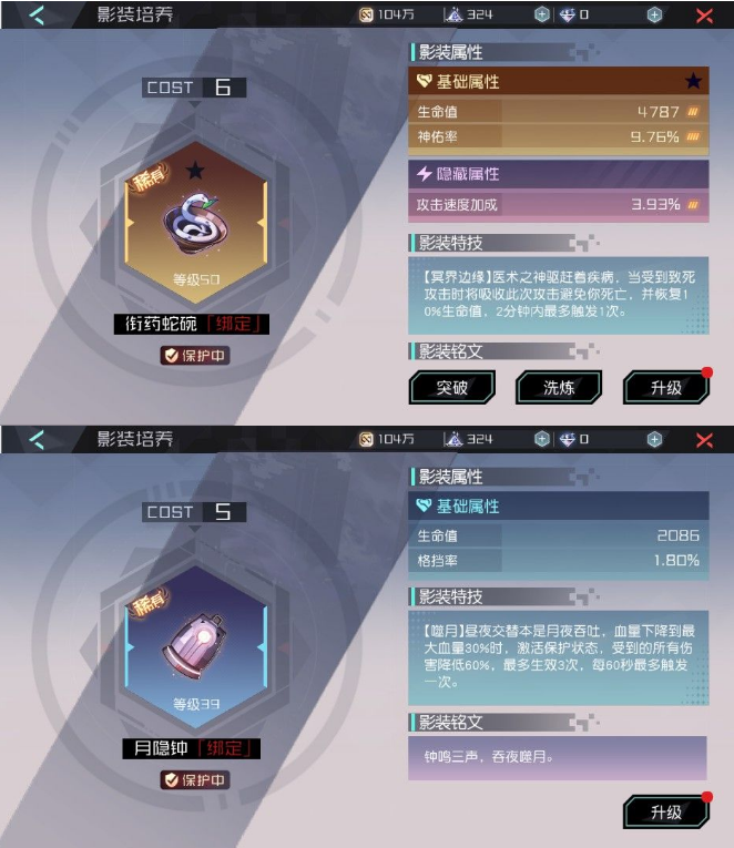 月影钟的格挡属性也比蛇碗的神佑属性也更适合flag,月影5cost蛇碗6cost来看月影钟也更划算,所以大家以后还是带月影钟吧,蛇碗只有拉比八虎哥那种关卡卡bug能上了。