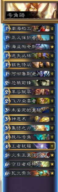 核心就是战斗号角,可以招募低费随从,不过现在帕奇斯的削弱,可以考虑替换掉。