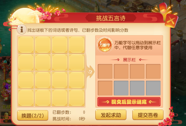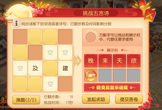 谜板分为25宫格和16宫格,每个格子下面随机有正确字、混淆字、空白、甜蜜元宵和火辣元宵,玩家需要找出正确字然后移到展示栏组成字词,以上面图片为例子,及和建就属于混淆字、晚来天欲是正确字、万能字在每次活动开始前能免费获得一个,可以取代任何字,这样正确答案就是晚来天欲雪,提交即可。