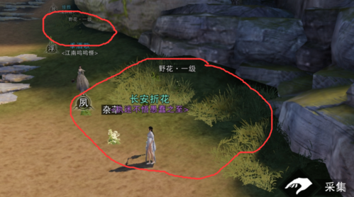 图中红圈这两片区域分别会有2野花2杂草轮流刷出,基本上可以站着不动一直采,如果人多竞争大可以换线,准备好足够的工具在这基本可以采到10级。