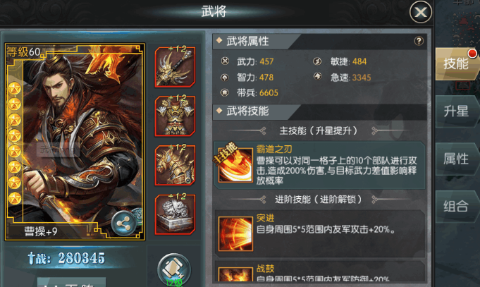 武将可消耗对应数量的进阶石和同名的武将碎片进行武将进阶操作;进阶后的武将会解锁新的技能和提升属性。