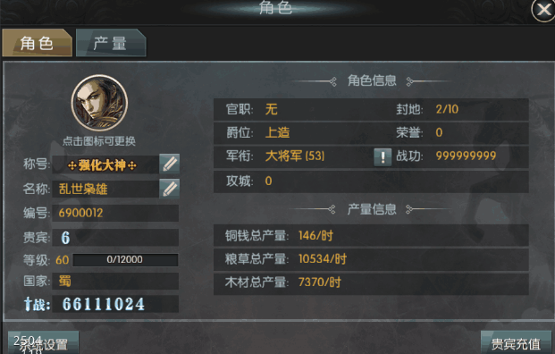主角所有信息:封地、攻城以及产量信息等;