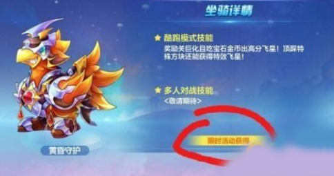 2018年2月28日开启天天酷跑S4锦标赛赛季,玩家可参与锦标赛提升段位,获取奖励宝箱,其中还新坐骑黄昏守护。不过暂时黄昏守护多人技能还没公布。从此前的锦标赛头奖来看,黄昏坐骑在多人和单人模式中应该都有不错的得分能力。