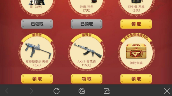 与一样不同的是,这一次大家可以自由选择喜欢的武器作为签到奖励!而且排列顺序后有防手抖机制,大大降低了玩家们失手点错武器的情况!CFM的活动不得不说越来越人性化的耶!这样的游戏难道不值得我们玩吗?倾墨给大家提供一种选择方式:零—伯爵—变鸡—斯太尔—青花瓷。倾墨觉得除了零必选之外其他的武器都可以按照自己的口味来。疾光双刃也是这次活动的范围喔,上次出售了也没关系,5天一共100零件,只是疾光双刃又出现在活动里,有没有惊喜呢?