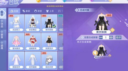 固定的服装需要对应的服饰碎片合成。例如黑色抹胸服饰合成需要150个黑色珍珠碎片合成获得。