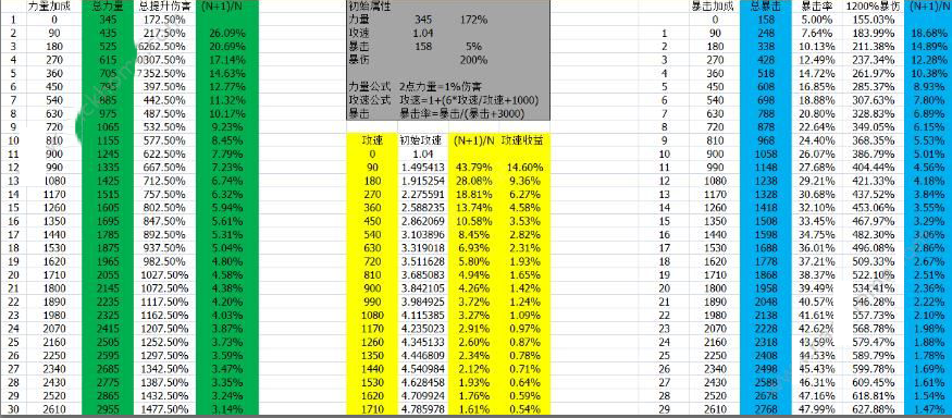 力量属性以345为基础,之后每增加90力量,DPS整体收益为26.09%,20.69%,17.14%,14.63%,12.77%--------------------------------直到2955力量时,收益递减在3.14%左右