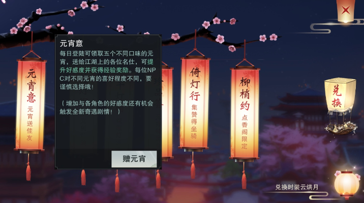 元宵活动期间每日登录游戏可获得五款不同口味的元宵,送给江湖上的各位名仕可提升好感度并获得经验奖励。