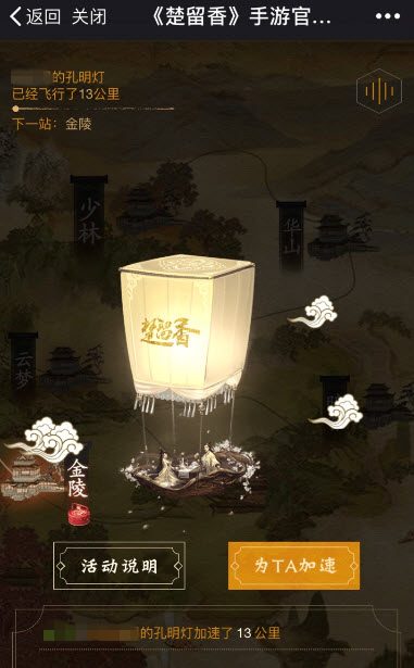 分享孔明灯到微信朋友圈,邀请好友点赞助力,可积累孔明灯飞行里程,赢取丰厚奖励,还可获得大量孔明灯双人坐骑“灯如昼”碎片“华灯星火”。帮助回归玩家完成日常玩法也有机会积累里程。
