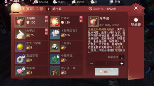 活动内容:天风吹散赤城霞,散落人间作九华。元宵节活动期间,元宵珍品荟限时出售珍稀宝匣--九华匣。3.2日更新后,天机阁新推出了绿色和蓝色的特技谱,打造装备时加入此类道具可以使本次打造必获得相应的绿色或蓝色特技,绿色和蓝色特技谱在九华匣中概率开出。除此之外,九华匣还会开出:紫色特技谱-开物·惊鸿、开物·