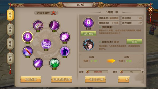 八阵图是逍遥派的又一大招,它能对预订敌目标以及敌目标周边的敌人造成大量攻击伤害,而且还具备散功效果。钟灵的指点能进一步弱化敌人的攻击能力,它可以大幅度吸收敌人的气,这样可以弱化敌人的各种大招攻击,甚至在关键时刻,激发大招时更是无气可用。如果能够和暗器技能中的自赏技能来配合使用,那么无论是概率免疫护盾还是伤害转化治疗能力,都会让逍遥派大侠在战斗中更加持久。