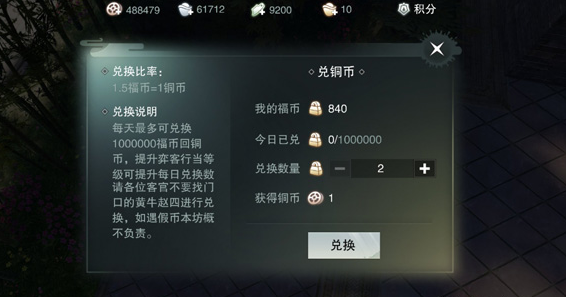 2、兑换铜钱,比列为1.5:1(提升弈客行当等级可提升每日兑换数)