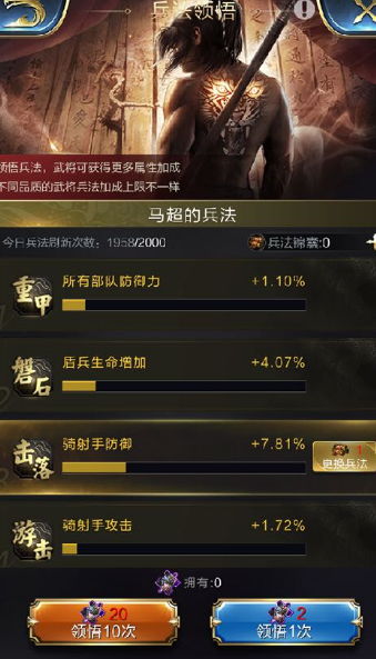 重甲:提升全部兵种的防御力,最高培养到12%左右。