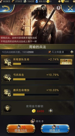 必中(弓兵攻击)提升弓兵攻击的技能,也是周瑜第一首选升级的兵法,最高可以提升到35%左右,所以说这个兵法相当于一个技能的加成,所以这个周瑜兵法非常强势的。