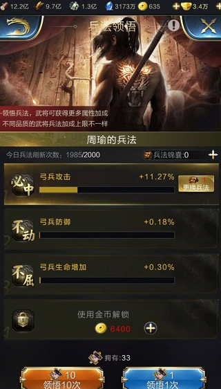 不同颜色的武将最高品质是不一样的,橙色的就是最高的,每次更换兵法会获得兵法的研究进度,这样就是加成在新兵法上。但是兵法一解锁都是0.01%的加成,这个加成非常之低,可以所基本没啥用,这个时候我们就是要领悟兵法。