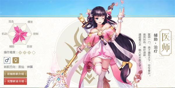 医师,是武林中历史最为悠久的职业之一,最早可以追溯到一千多年前。千年来,医师一门一直活跃江湖,天下弟子众多。其门下弟子救死扶伤,锄奸退敌,通岐黄之术,晓八卦术数之学,擅长辅助和治疗,吟诵咒语治疗和增强队友,防御相对较强,攻击不足。