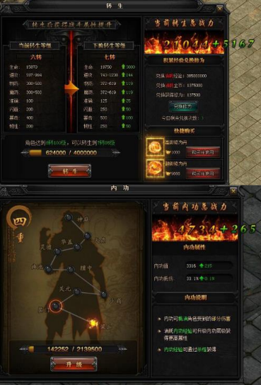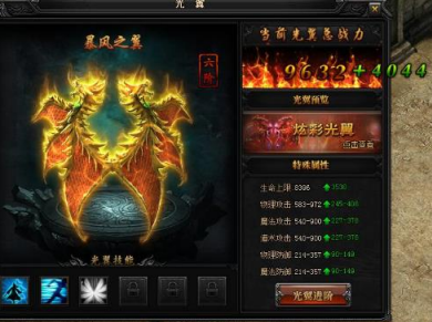 角色属性可是很变态的一个系统,翅膀、转生、内功这三大系统带来的属性非常可观。全面增幅的翅膀、转生,还有能让你硬得起来的内功增幅,简直是无双搭配。特别说一句,翅膀不单单外表炫酷,属性变态,最重要的是“光翼技能”!!!