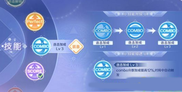 2、连击加成:这个技能可以提高歌曲音符COMBO得分,比较适合可以达成歌曲ALL COMBO评价的玩家。