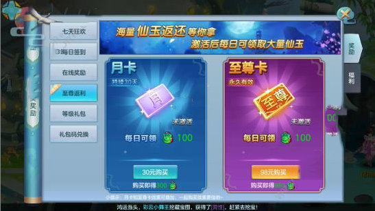 至尊卡需要98元购买,有效期是永久,直接获得980仙玉,每天可以领取100。