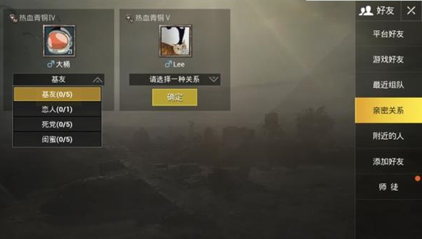 好友之间一起开黑或者互赠金币都可以获得亲密度,当亲密度积攒到一定数值,玩家就可以选择和好友建立更加亲密的关系。亲密关系类型:基友,恋人,死党,闺蜜。