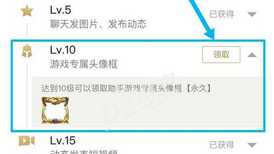 第四步、等级特权包括3、4、5、10、15、20、30,10级玩家可以领取到头像框,这个是游戏内使用的!不是助手用!