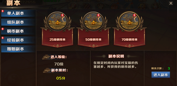 铜币副本:攻击或击杀可获得大量铜币,每日限次,建议刷完
