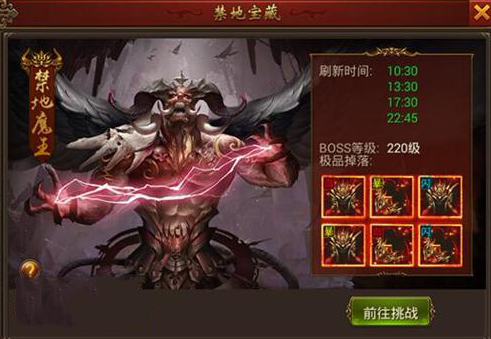 禁地魔王是强大的世界Boss,在每天的10:30,13:30,17:30和22:45四个时间点,会分别刷新一次。禁地魔王刷新后,禁地入口开放,玩家有15分钟的时间可以进入禁地内。禁地魔王会存在1个小时,玩家只要在这个时间内击杀禁地魔王,即可获得禁地魔王掉落的海量奖励。