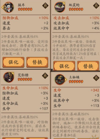 4、土蜘蛛:攻击怪物时,施加一个降低10点速度的蛛毒标记,使其在回合结束后受到额外23%的毒伤,该标记最多叠加3层。