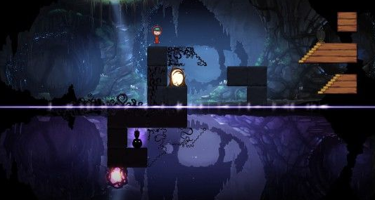 首先在终点位置,摆放一个小梯形方块,需要注意,这个方块的倒影必须是挡住主角去路的哦!