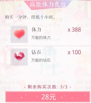 高能体力礼包:内含【体力*388,钻石*100】