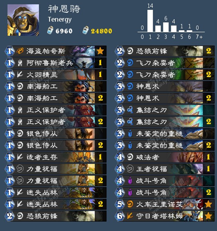 天下武功,唯快不破。这套神恩骑在美服打到了相当好的传说14名。这套牌给对手制造的前期压力很大,力量祝福配合有圣盾的随从,很快就可以叫杀对手。除了火车王和超管,其余的牌都是四费以下,让神恩术在任何对局中都可以起作用。