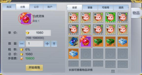 出售物品,点击右边物品栏内的物品,设定单价以及数量即可开始寄售。注意设定的价格是单件物品的价格哦,而且价格的制定有所限制,防止恶意抬价出售,赞!上架商品持续24小时哦,可自行下架。
