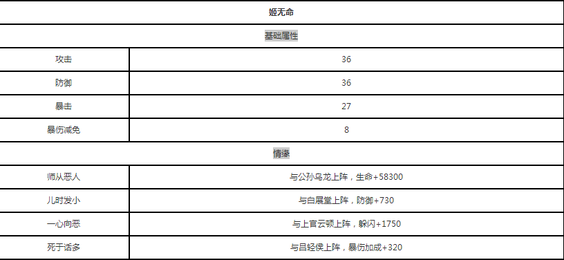 姬无命的属性一般般,但是情缘属性很不错,在跟公孙乌龙和上段云顿上阵的时候情缘属性加成较高,建议大家再搭配这两个侠影的时候使用,值得入手哦!