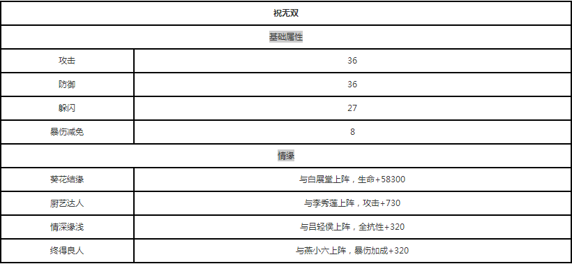 从表中可以看出,祝无双和白展堂同时上阵时情缘属性还是很不错的,直接加5w8的生命,与其余几个侠影搭配属性也还行,建议各小伙伴入手!