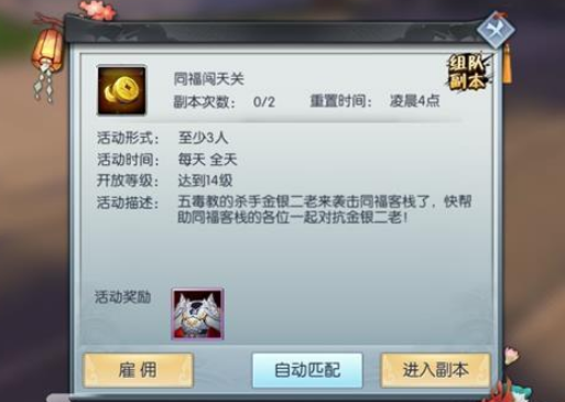 客官可以点击主界面中的活动按钮,在活动列表中找到同福闯天关,点击即可参加副本。
